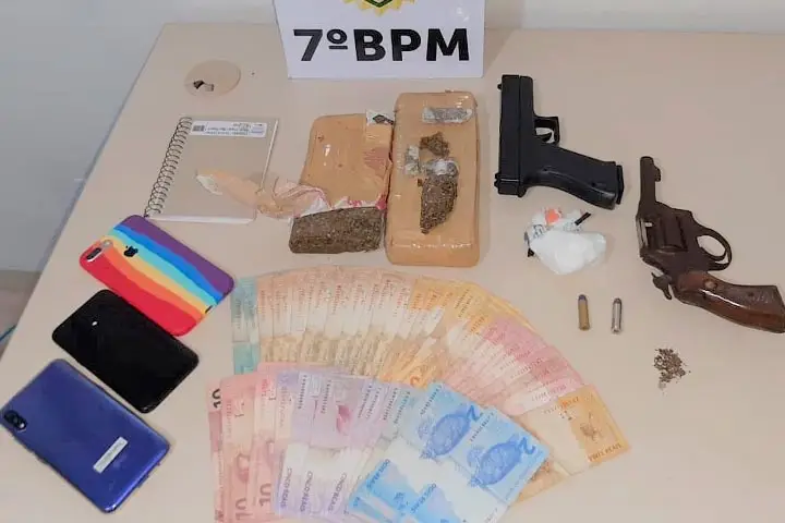 Na estante da sala também foram encontradas porções de maconha, a quantia de R$ 1.068,00 e em uma bolsa foi localizado um revólver calibre 38 e um simulacro de pistola.