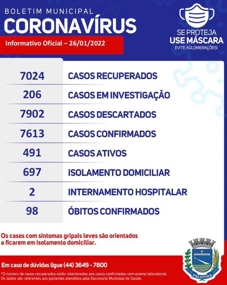 A Secretaria de Saúde divulgou o Boletim Covid por volta das 12h. O relatório aponta que nas últimas 24 horas mais 93 novos casos de Covid-19 foram confirmados no município, 51 pacientes se recuperaram, 2 palotinenses estão internados e o número de casos ativos somam 491.
