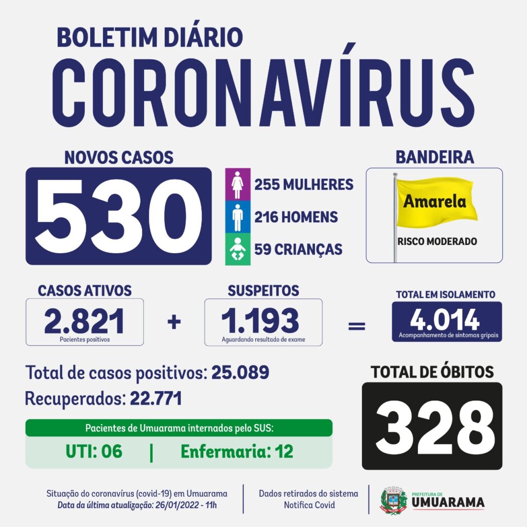 A Secretaria Municipal de Saúde de Umuarama divulgou na tarde desta quarta-feira (26) que 530 novos casos de covid-19 foram confirmados na cidade, sendo 255 mulheres, 216 homens e 59 crianças. O total de casos ativos aumentou de 2.508 para 2.821 e o número de suspeitos caiu de 1.295 para 1.193, indicando que 4.014 pessoas estão em isolamento domiciliar.