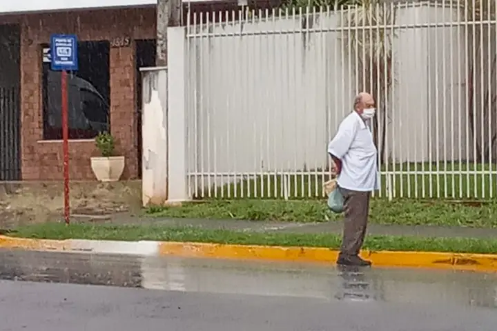 Nesta semana uma cena chamou a atenção de quem passava pela avenida Portugal. Um senhor ficou debaixo de chuva aguardando o ônibus do transporte coletivo. O fato ocorreu na manhã da última quinta-feira (27).