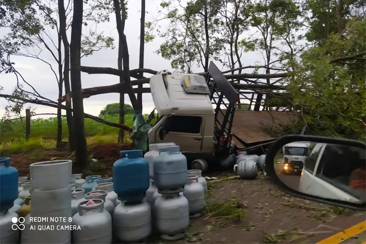 Com o impacto uma árvore chegou a cair sobre o veículo. Os botijões de gás se espalharam na pista da rodovia e populares ajudaram a recolhê-los.