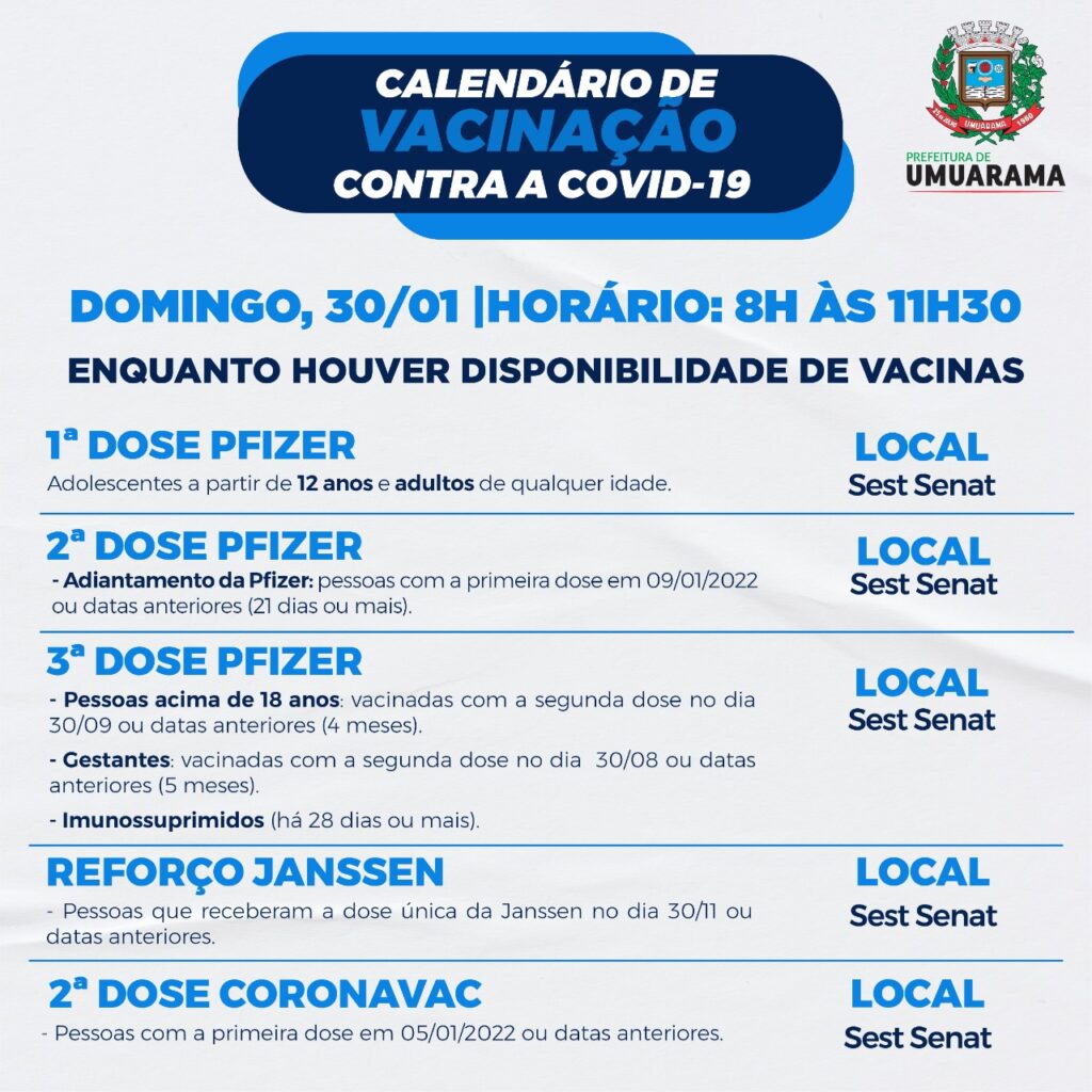 A Secretaria de Saúde de Umuarama divulgou que na manhã deste domingo (30) haverá vacinação para adultos contra a Covid. Serão aplicadas primeira, segunda e terceira doses da Pfizer, segunda dose da Coronavac e reforço Janssen. Confira os detalhes abaixo: