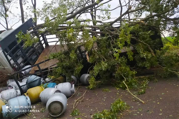 Alguns botijões de gás ficaram espalhados pela rodovia estadual. Um veículo Renault/Captur, placa de Umuarama, acabou atingindo alguns destes botijões.