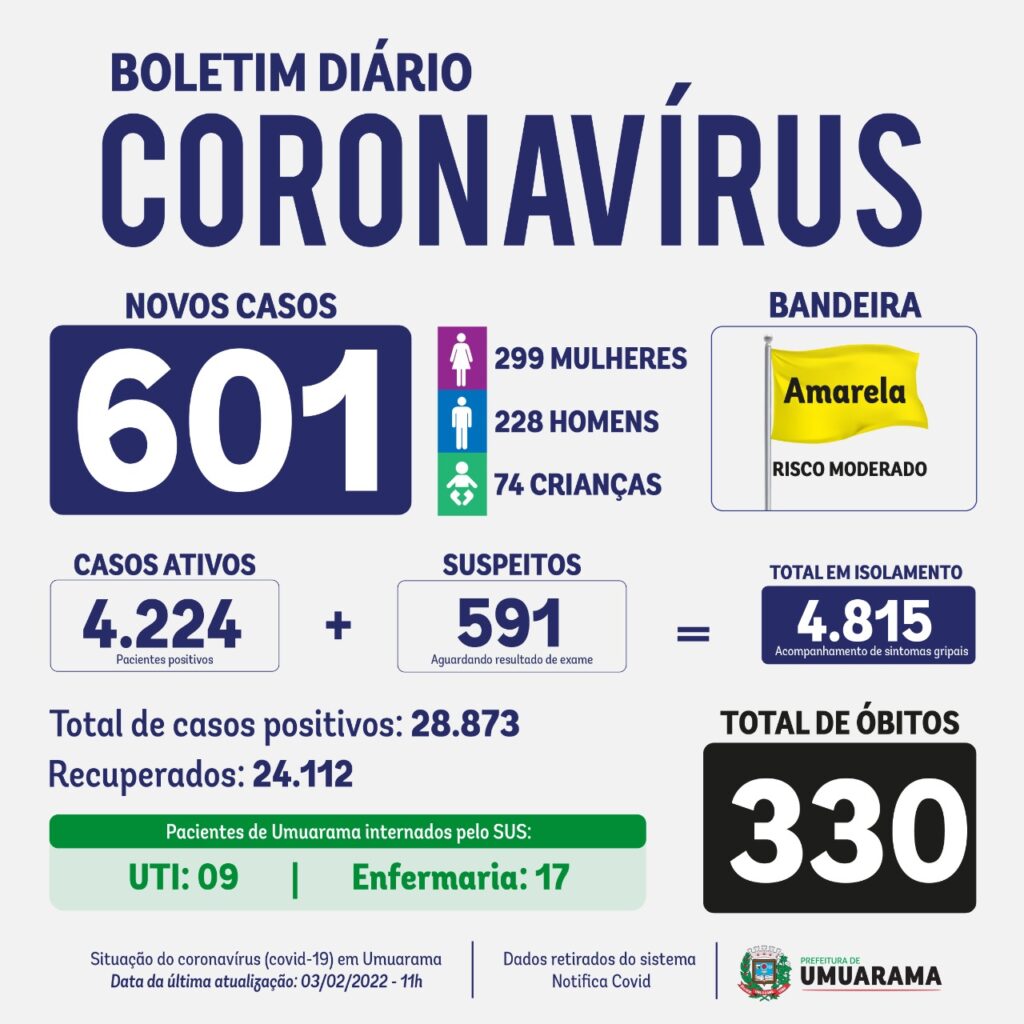 Com as atenções voltadas para a situação do coronavírus na cidade, a Secretaria de Saúde de Umuarama mantêm-se alerta com a chegada de dados a respeito da covid-19. O Boletim Covid desta quinta-feira (3) informa que 601 novos casos foram confirmados – são 299 mulheres, 228 homens e 74 crianças.