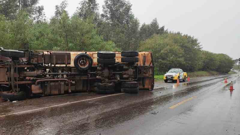 Caminhão carregado com mandioca tomba na rodovia PRC-272, perto de Iporã
