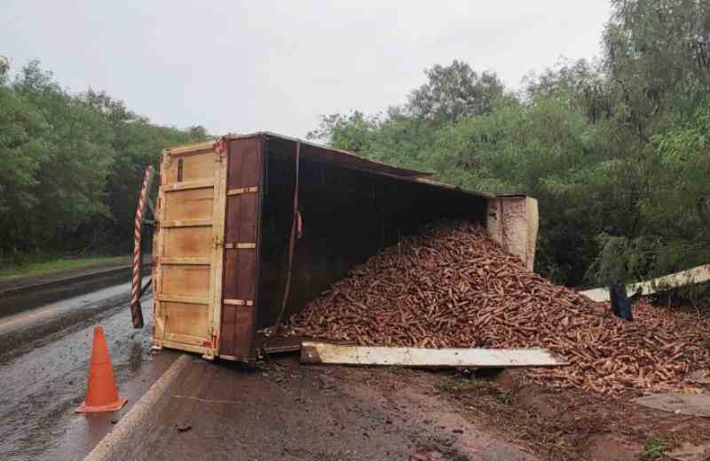 Um caminhão carregado com mandioca tombou na rodovia PRC-272, Km 515 + 950m, em Iporã. O acidente aconteceu na tarde desta quinta-feira (3), por volta das 16h20, perto da Vila Rural.