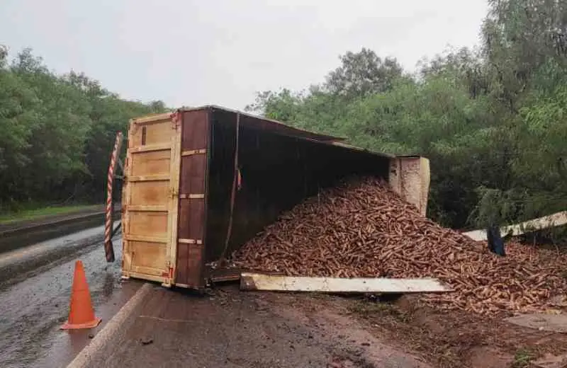Um caminhão carregado com mandioca tombou na rodovia PRC-272, Km 515 + 950m, em Iporã. O acidente aconteceu na tarde desta quinta-feira (3), por volta das 16h20, perto da Vila Rural.