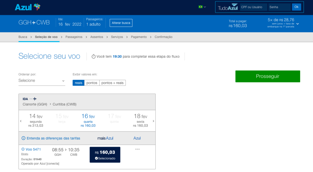 A Azul está com voos de Cianorte a Curitiba por R$ 160. A tarifa estava disponível no site de vendas da companhia na tarde deste domingo (6) e apresentava disponibilidades para a quarta-feira (16/2), sexta-feira 18/2) e segunda-feira (21/2) e datas seguintes.