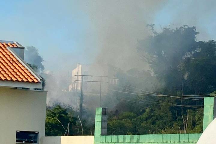 Bombeiros combatem incêndio em vegetação; chamas chegaram perto de casas
