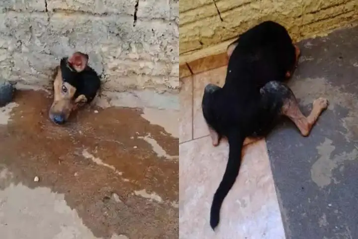 Um cãozinho ficou com a cabeça presa em um buraco no muro de uma residência e deu trabalho para o Corpo de Bombeiros. O fato foi registrado na última quarta-feira (9) na cidade de Paiçandu.