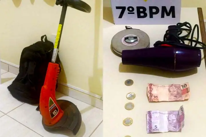 O suspeito estava com uma mochila, onde estavam um secador de cabelo e algumas peças de ferramentas. Questionado a respeito dos objetos, ele confessou ter subtraído de uma residência, bem como afirmou ter vendido a máquina de cortar grama pelo valor de R$ 20.