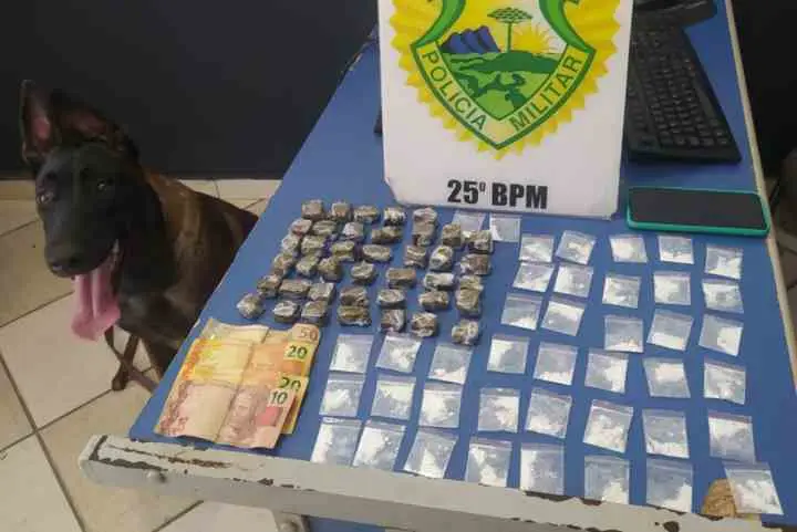 O cão de faro foi colocado para fazer buscas e após alguns minutos encontrou duas sacolas plásticas. As embalagens continham diversas porções de cocaína e maconha, além de R$ 100, que estava dentro da sacola.
