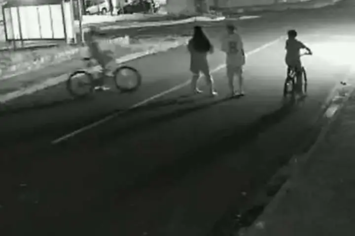 A jovem de cabelos compridos que aparece no vídeo mexe no celular na companhia de dois amigos. O criminoso chega até o grupo de bicicleta, desce e rouba a estudante fazendo ameaça com arma de fogo.