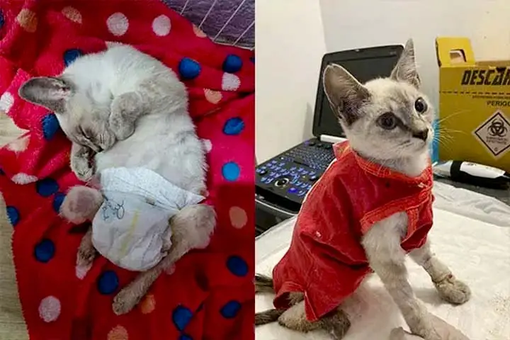 A gata foi encontrada na região por uma moradora, que entrou em contato com a médica veterinária Rebeca Dorneles após perceber que a gatinha andava se arrastando. A equipe então avaliou a situação do animal. Foi constatado que ela apresentava um problema intestinal e não conseguia defecar, além de não conseguir mais andar.