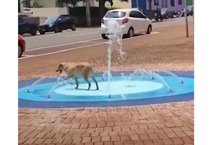 ‘Calor do cão’: Cachorro é flagrado se refrescando em chafariz de praça