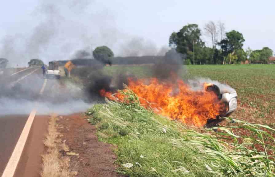 Veículo com placa de Mariluz capota e pega fogo na rodovia PR-495