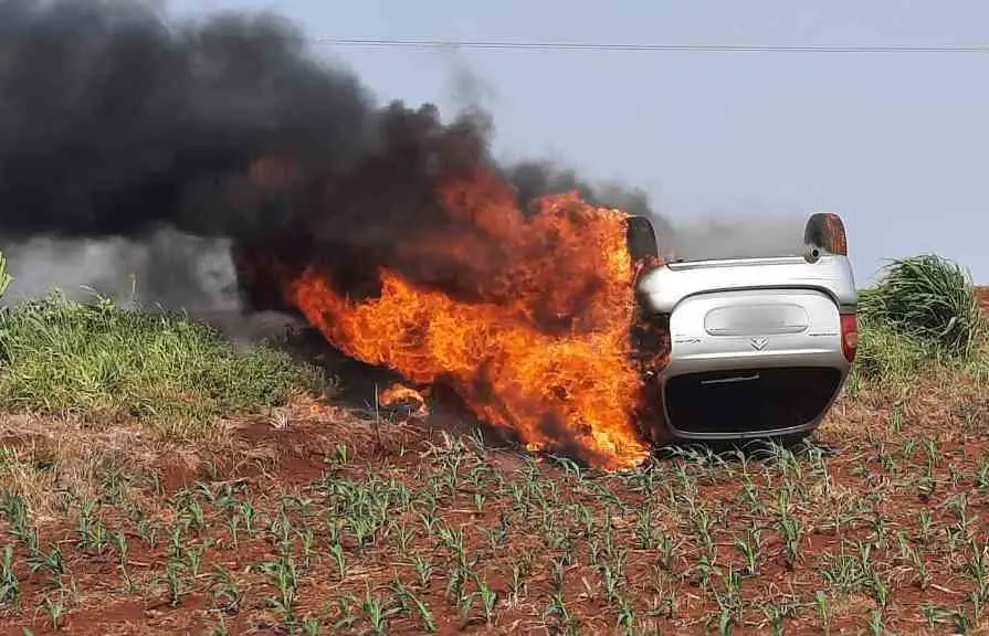 Um veículo com emplacamento em Mariluz ficou destruído após capotar e pegar fogo. A situação foi registrada por volta das 9h30 de sábado (19) na rodovia PR-495 KM 066, entre os municípios de Céu Azul e Missal.