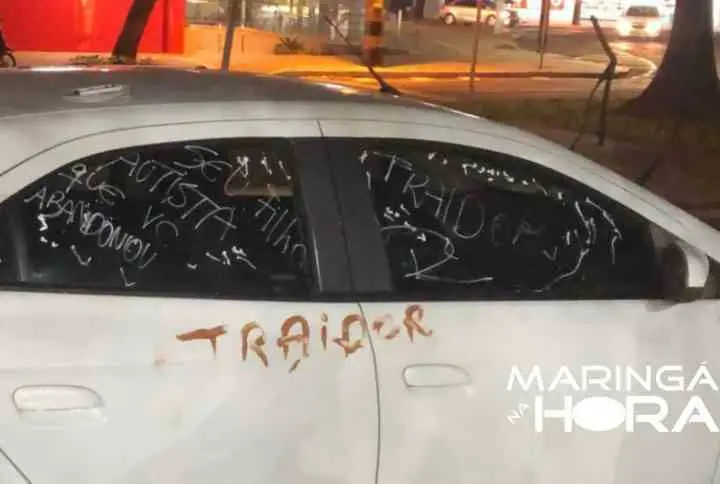 Imagens de um veículo vandalizado tomaram conta das redes sociais de Maringá neste domingo (20). Nelas é possível ver que foram usadas tintas para pichar palavras como ‘traidor’ e algumas frases no automóvel Onix, de cor branca.