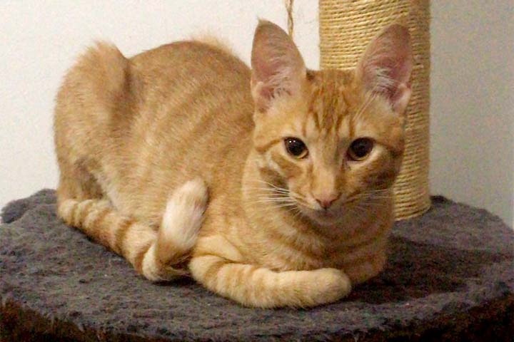 Karê é um gatinho macho castrado, de porte pequeno, com pelagem amarela rajada, com idade de oito meses.