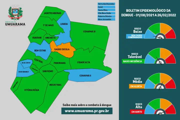 Já no 26 de Junho, Bem-Estar, Jardim Lisboa, Ouro Branco e São Cristóvão, bem como dos distritos de Serra dos Dourados, Santa Eliza, Lovat, Roberto Silveira e Vila Nova União, ainda não houve registro da doença. As autoridades reforçam o apelo à população para eliminar possíveis criadouros do mosquito transmissor da dengue, especialmente com a incidência de chuvas e calor dos últimos dias.