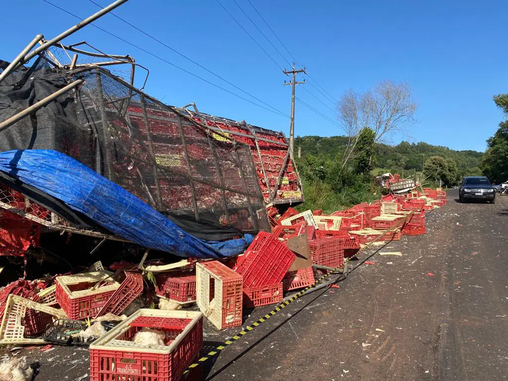 O caminhão Ford Cargo transportava uma carga de frangos vivos. Muitos animais morreram no acidente.