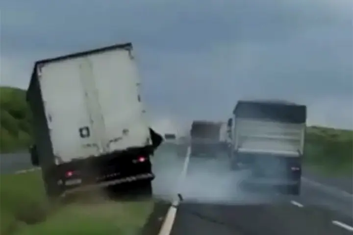 As filmagens mostram uma carreta tentando ultrapassar um caminhão baú, que não dá margem, se mantendo na pista da esquerda. Após conseguir emparelhar o veículo pela direita, o motorista da carreta então colide contra o caminhão baú, que vai parar no canteiro central da rodovia com o baú do veículo danificado.