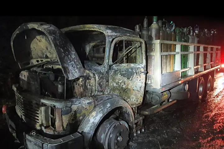 Um caminhão Mercedes Benz com cilindros de oxigênio vazios pegou fogo por volta das 5h30 desta sexta-feira (4), no km 193 da BR 376, em Marialva. O condutor não se feriu.