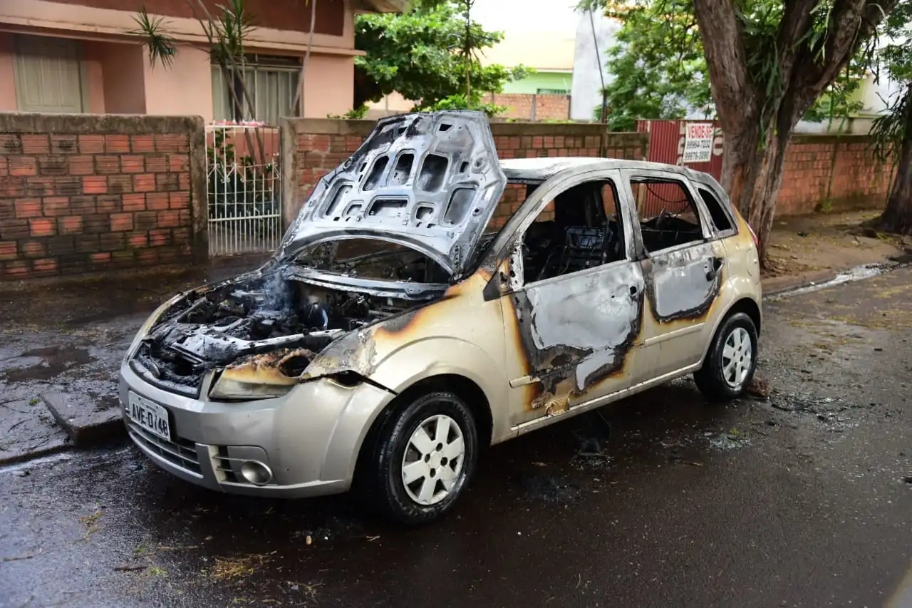 Um veículo Ford Fiesta, placas AVE 0148, de Umuarama, foi destruído pelo fogo na tarde desta sexta-feira (4), na Rua Goiás, zona 2 do município. Ninguém estava no veículo no momento do incêndio criminoso. O principal suspeito do crime é o padrasto da proprietária do carro.