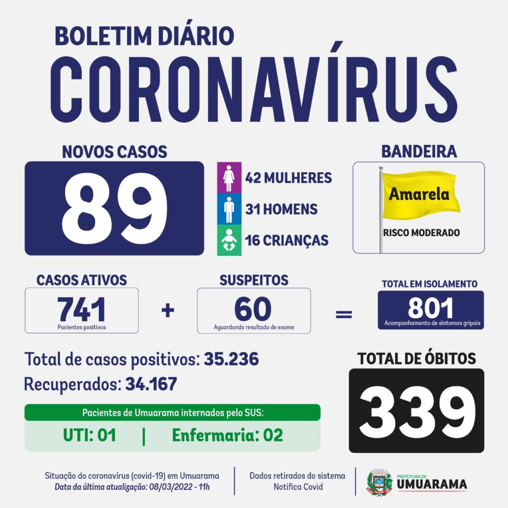 Nesta terça-feira (8) o Boletim Covid, emitido diariamente pela Secretaria Municipal de Saúde, informa que 89 novos casos da doença foram confirmados na cidade (42 mulheres, 31 homens e 16 crianças).