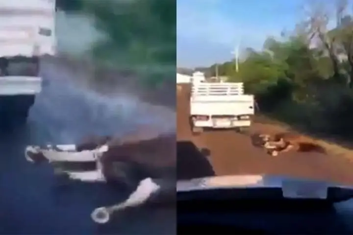 Um motorista aparece nas imagens gravadas pela passageira de um carro arrastando um cavalo preso por uma corda a uma caminhonete. A cena foi gravada na manhã desta quarta-feira (9), na BR 163, próximo a cidade de Capitão Leônidas Marques.
