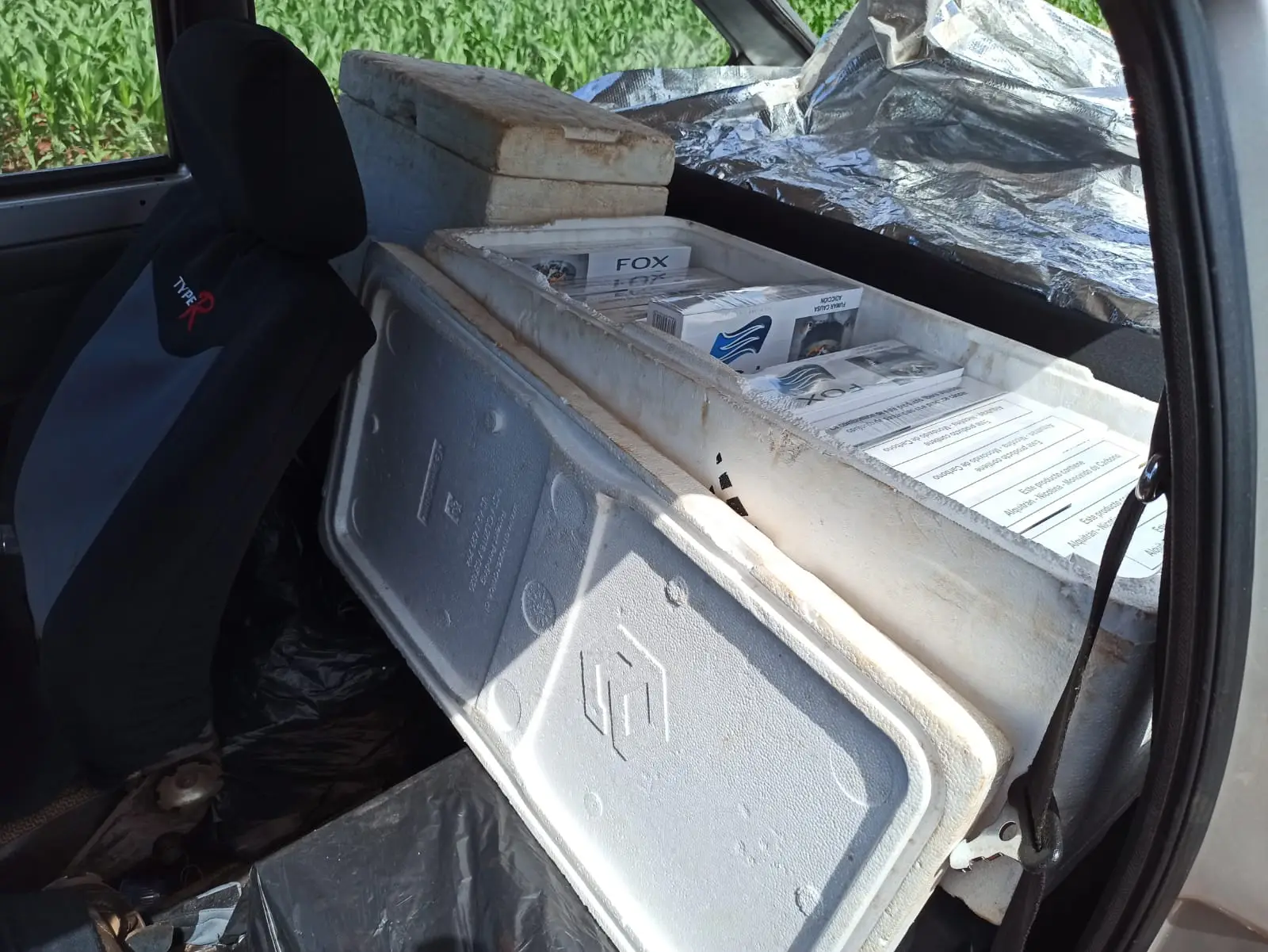 Os pacotes de cigarro estavam no porta-malas do veículo, encobertos por um papel alumínio. Também foram encontrados pacotes dentro de caixas térmicas, dissimulados como transporte de laticínios.