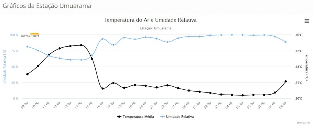A semana encerra na Capital da Amizade com o céu parcialmente nublado e previsão de pancadas de chuvas ao longo desta sexta (11). De acordo com Simepar, por volta das 9h da manhã, a temperatura na cidade era de 24.3°C, com alta umidade relativa, o que garantiu uma manhã mais fresca aos umuaramenses. No gráfico abaixo é possível ver que no período da tarde há uma queda brusca na temperatura. Previsão é de máxima 29°C e mínima 22°C.