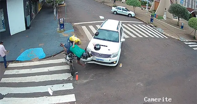 Nas imagens é possível ver que, a motorista da caminhonete Hilux Sw4 e o condutor da motocicleta Suzuki trafegavam pela Avenida Daniel Portela. O acidente acontece quando a condutora faz uma manobra para subir no sentido ao calçadão e a motocicleta que vinha logo atrás colide na lateral do veículo.