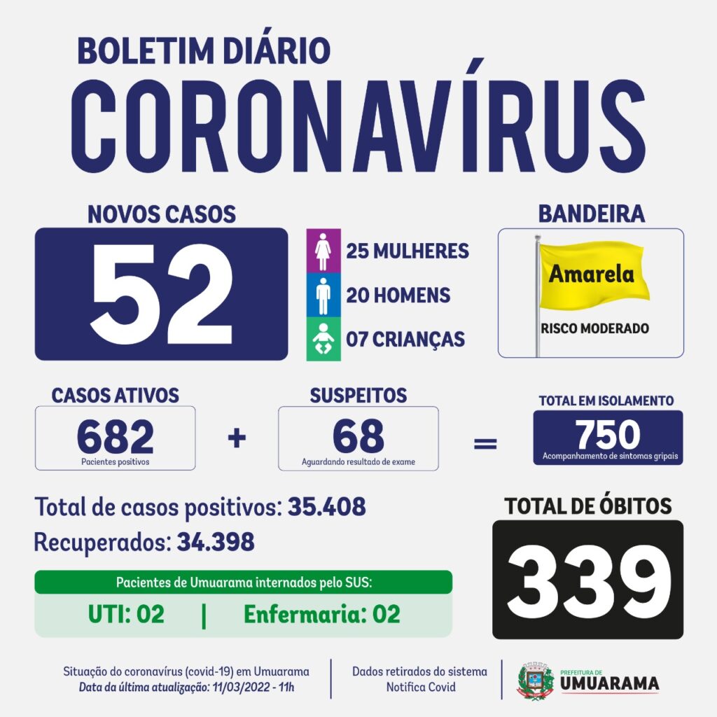 A Secretaria Municipal de Saúde informa diariamente a situação da pandemia de coronavírus em Umuarama. No informativo desta sexta-feira (11), 52 novos casos da doença foram confirmados, sendo de 25 mulheres, 20 homens e sete crianças. A média de casos desta semana ficou em 59 e novamente nenhuma morte foi oficialmente registrada, com um total de 339 óbitos.
