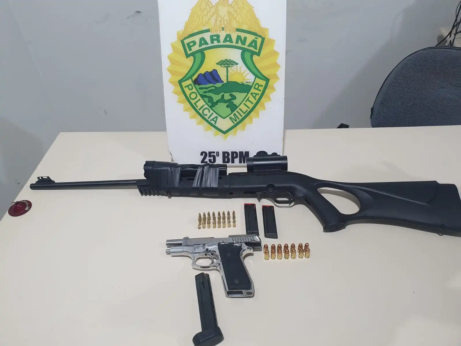 Foram apreendidos: 1 pistola PT 58 HC Plus, 14 munições intactas, 1 Carabina Mag Tech Model 7022 calibre 22 com dois carregadores e 23 munições calibre 22 intactas.