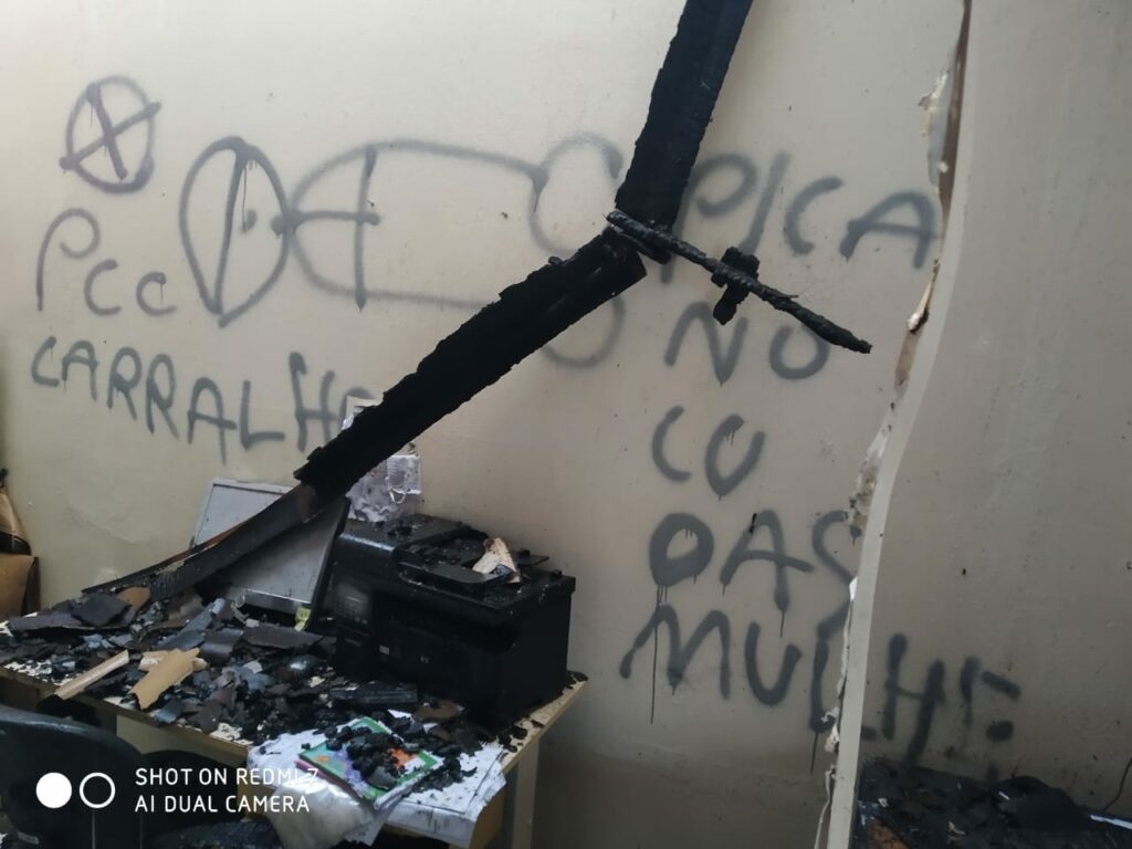 Em uma das paredes os criminosos deixaram escrito a sigla de uma facção criminosa – PCC, além de frases de cunho obsceno e sexista. Porém, ainda não é possível afirmar a ligação do PCC com as chamas que consumiram a escola.