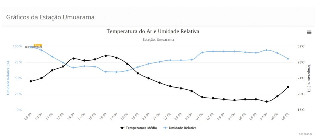 Em Umuarama, a temperatura tem uma leve elevação para os próximos dias. Na quarta-feira (16) o tempo é ensolarado e com temperaturas entre 31°C e 19°C, e na quinta-feira (17) os termômetros deverão se manter em 33°C e 20°C. Não há previsão de chuvas para ambos os dias.