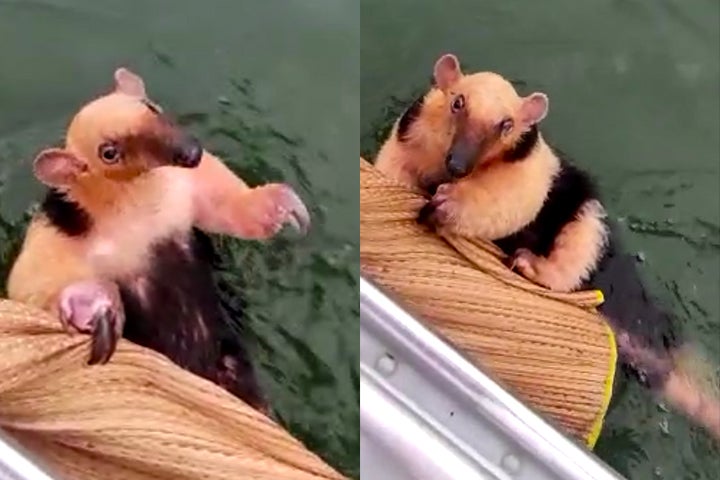 Tamanduá que estava se afogando no Rio Paraná é resgatado por casal de pescadores