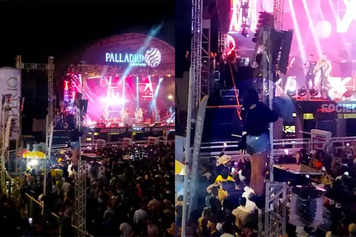 Uma mulher subiu em uma estrutura metálica do sistema de som do show da dupla Henrique & Juliano, no Parque de Exposições Dario Pimenta da Nóbrega, durante a Expo de Umuarama. Logo em seguida ela acabou despencando da estrutura e caiu em cima de um segurança.