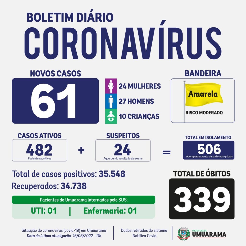 O Boletim Covid desta terça-feira (15) traz a informação de que há apenas uma pessoa de Umuarama internada em UTI e mais uma em enfermaria (ambas no hospital Uopeccan). O total de casos suspeitos também caiu de 50 para 24 e o número de casos ativos caiu de 492 para 482, o que indica que 506 pessoas estão em isolamento domiciliar.