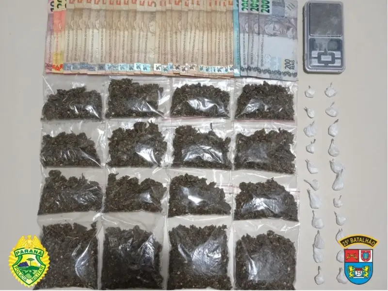 Após autorização, foram realizadas buscas na casa do homem de 25 anos, no local foram encontradas 16 porções de maconha, cocaína, aproximadamente R$ 2 mil em notas trocadas, balança de precisão e dois celulares que eram usados para fazer a venda da droga por meio de APPs.