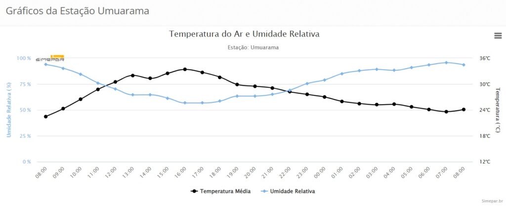 Em Umuarama, previsão é de que o sábado (19) siga sem chuvas, com temperaturas variando entre 28°C e 21°C, e muita presença de nuvens. No domingo (20) há um leve aumento nas temperaturas, que deverão se manter entre 30°C e 22°C, porém neste dia não se descarta a ocorrência de pancadas de chuvas.