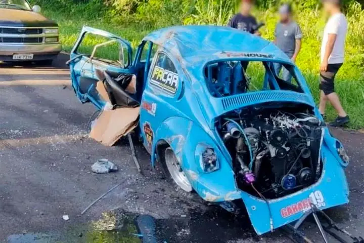 No arrancadão de Campo Mourão, neste domingo (20), um VW/Fusca capotou pelo menos sete vezes e por sorte o piloto Lucas França, de Maringá, saiu ileso.
