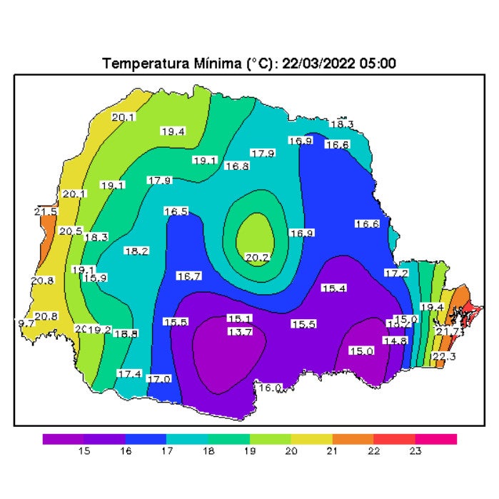 De acordo com Lidia Luisa Mota, meteorologista da Simepar, garoas ocasionais seguiram sendo observadas sobre o litoral, RMC e regiões do sul do Paraná ao longo da madrugada desta terça-feira (22), regiões estas nas quais houve também uma maior concentração de nebulosidade. No mapa é possível observar também as temperaturas mínimas registradas na última hora.