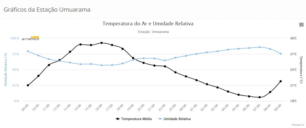 Em Umuarama, na quarta-feira (23), população pode esperar dia sem chuvas, com temperaturas se mantendo entre 32°C e 21°C. Na quinta-feira (24) a máxima poderá chegar até 34°C e mínima de 23°C, porém neste dia não se descarta a ocorrência de chuvas.