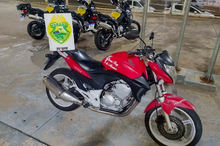 A Polícia Militar (PM) apreendeu na noite de quarta-feira (23) uma motocicleta com as características adulteradas. A apreensão aconteceu durante o patrulhamento pelo Parque Dom Pedro I, em Umuarama. O condutor da moto de 31 anos foi levado para procedimentos na delegacia de Polícia Civil.