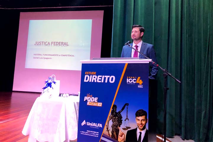 Spegiorin falou para as pessoas presentes na aula magna sobre todo o funcionamento da Justiça Federal, suas atribuições e, até mesmo, algumas curiosidades. Para finalizar, disse esperar que todos os alunos da UniAlfa se dediquem muito aos estudos, mas que não deixem de viver. “Todos podem. Se eu consegui, vocês também podem”, encerrou.