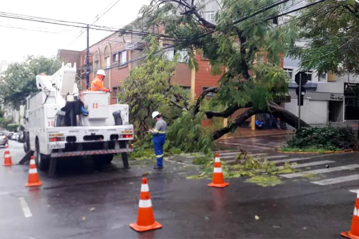 Equipes da Copel, Defesa Civil e Secretaria Municipal de Agricultura estão mobilizadas no local desde cedo para fazer o corte e o transporte da árvore. O trânsito foi interrompido no trecho em frente ao Colégio Estadual Professor Paulo Alberto Tomazinho (Ceppat).