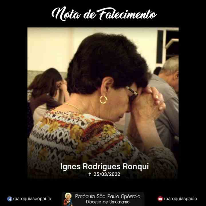 “É com pesar que informamos o falecimento da Sra. Ignes Rodrigues Ronqui, vítima de complicações de um AVC. Conhecida em nossa comunidade, Dona Ignes foi fiel e leiga dedicada especialmente como Ministra Extraordinária da Comunhão Eucarística e da Palavra (MECEP) em nossa paróquia por muitos anos”.