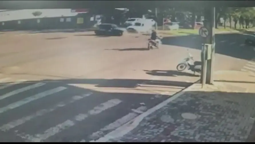 Um motociclista foi atingido por um semáforo que caiu após um acidente em Cascavel, na manhã deste sábado (26). Uma câmera de segurança registrou toda a cena.